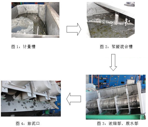 圖3.鞏花在濃縮部經(jīng)過重力濃縮,大量的濾液從濃縮部的濾縫中排出,濾液送回原水池或調(diào)節(jié)池。濃縮后的污泥沿著螺旋軸旋轉(zhuǎn)的方向繼續(xù)向前推進(jìn),在背壓板形成的內(nèi)壓作用下充分脫水。
